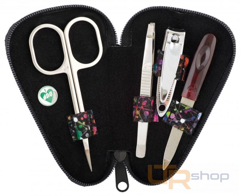 Malý 4-dílný manikúrní set vhodný do kabelky, kanceláře i auta. Obsahuje nejnutnější manikúrní nástroje značky DUP, je vyroben z pestré kůže . Uzavírá se na zip. Rozměry: 10,5 x 6,5 x 2 cm.