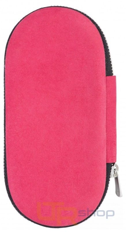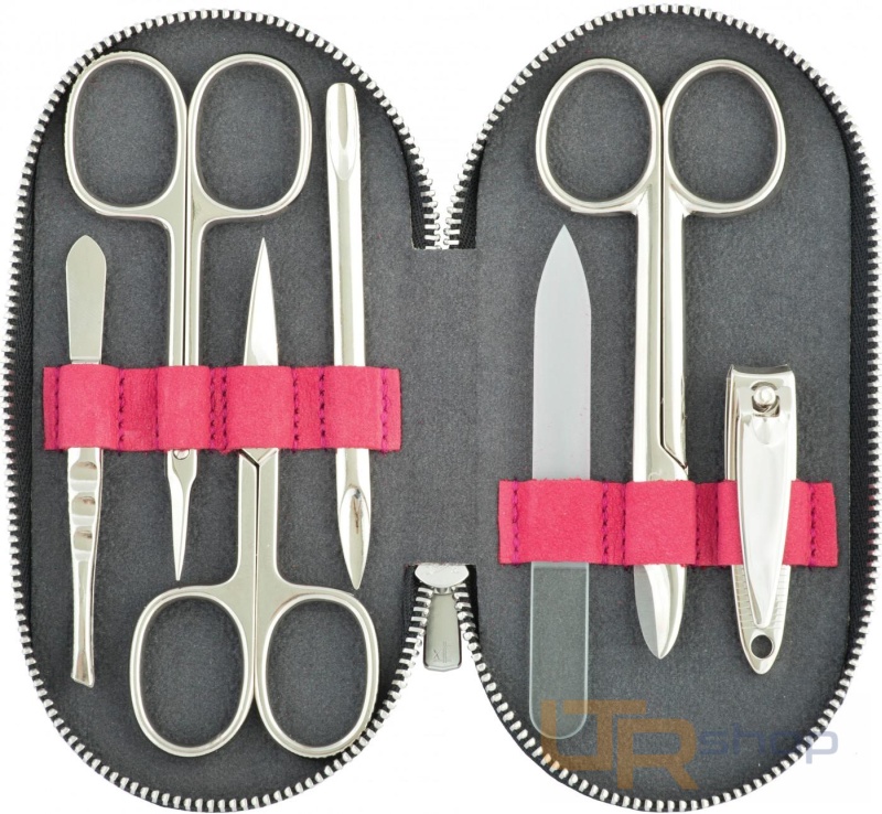 Manikúrní sada z červené/ malinové/ kůže se semišovým vzhledem, uzavíraná kovovým zipem.