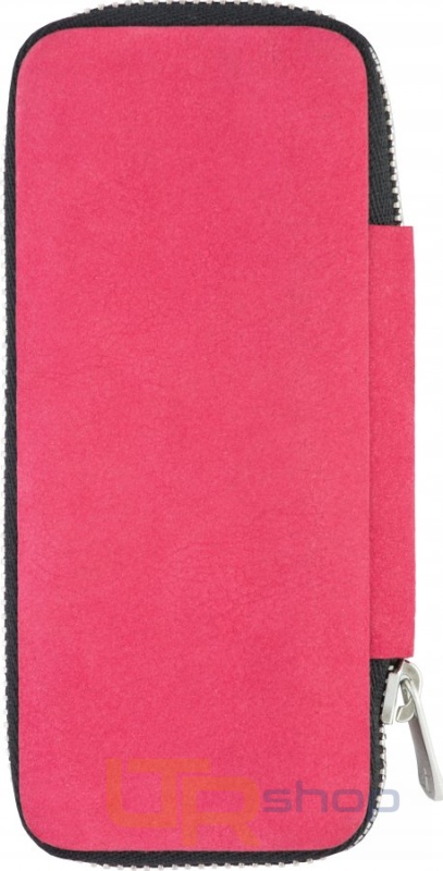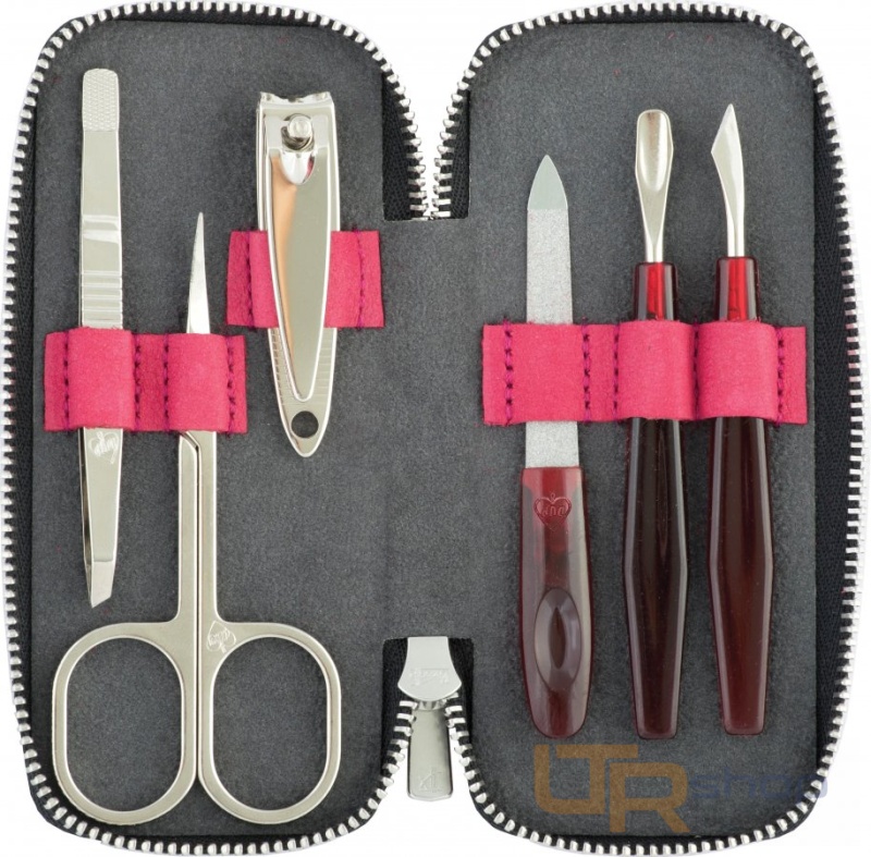 Manikúrní cestovní set s náčiním DUP. Pouzdro je ušito z červené /malinové/ kůže se semišovým vzhledem, uzavírá se kovovým zipem. Rozměry: 12,5 x 6 x 2 cm.