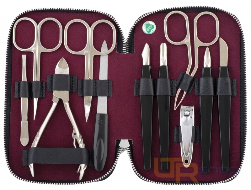 Rodinná plně vybavená 11-dílná manikúrní sada je vyrobena z černé kůže , obsahuje náčiní značky DUP a uzavírá se kovovým zipem. Je vhodná pro domácí i profesionální péči o nehty. Rozměry: 15 x 10 x 2 cm.