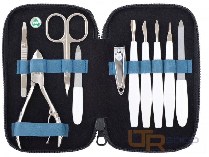 Manikúrní sada 10-ti dílná z modré kůže se semišovým vzhledem, obsahuje manikúrní náčiní značky DUP, které potěší každou ženu. Uzavírá se zipem. Rozměry: 15,5 x 10 x 2 cm.