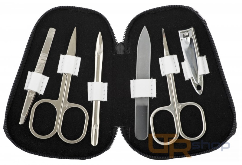 Elegantní manikúrní set 6-dílný, z nylonu s černobílým motivem, koženými poutky. Pouzdro se uzavírá na zip, je naplněno manikúrním náčiním značky DUP a skleněným pilníkem. Rozměry: 12x 9 x 2 cm.