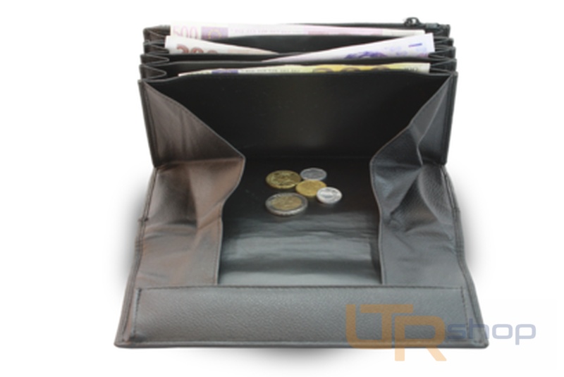 Velká přehledná kapsa na mince, 4 přihrádky na bankovky, 1 zipová kapsa a kapsa na zadní straně. Základní rozměr 19,5 x 11 cm. Materiál PDM, barva černá.