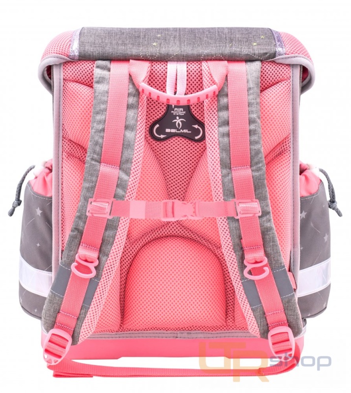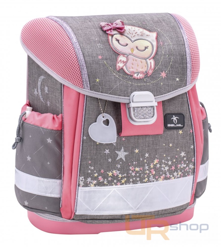Školní aktovka pro prvňáčku. Set s penálem a sáčkem. Integrovaný hrudní popruh. Výrobce Belmil. Doporučený věk: 6 - 9 let. Hmotnost pouhých 890 gramů.