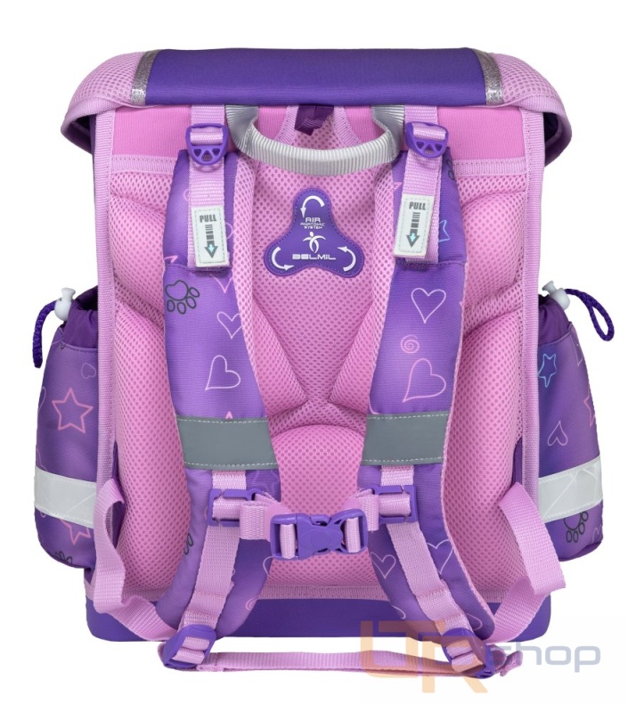 Aktovka je vybavena nastavitelným hrudním popruhem. Je obzvláště důležitý při běhu, protože zabraňuje sklouznutí tašky z dětských ramen.