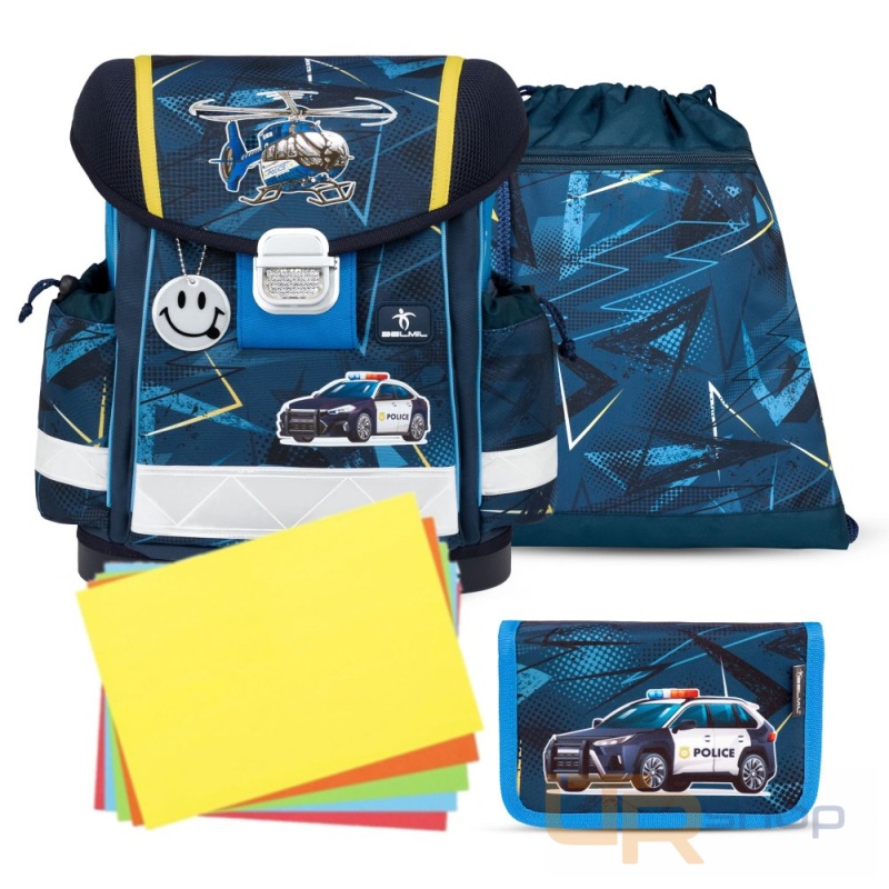 Školská taška pre prváka. Set s peračníkom a vreckom. Integrovaný hrudný popruh. Výrobca Belmil. Odporúčaný vek: 6 - 9 rokov. Hmotnosť iba 890 gramov