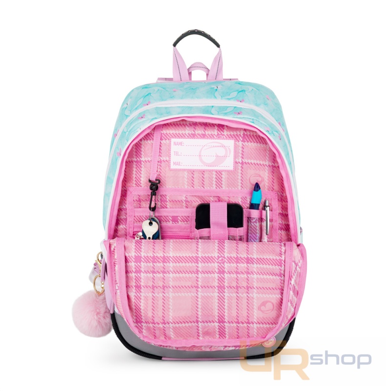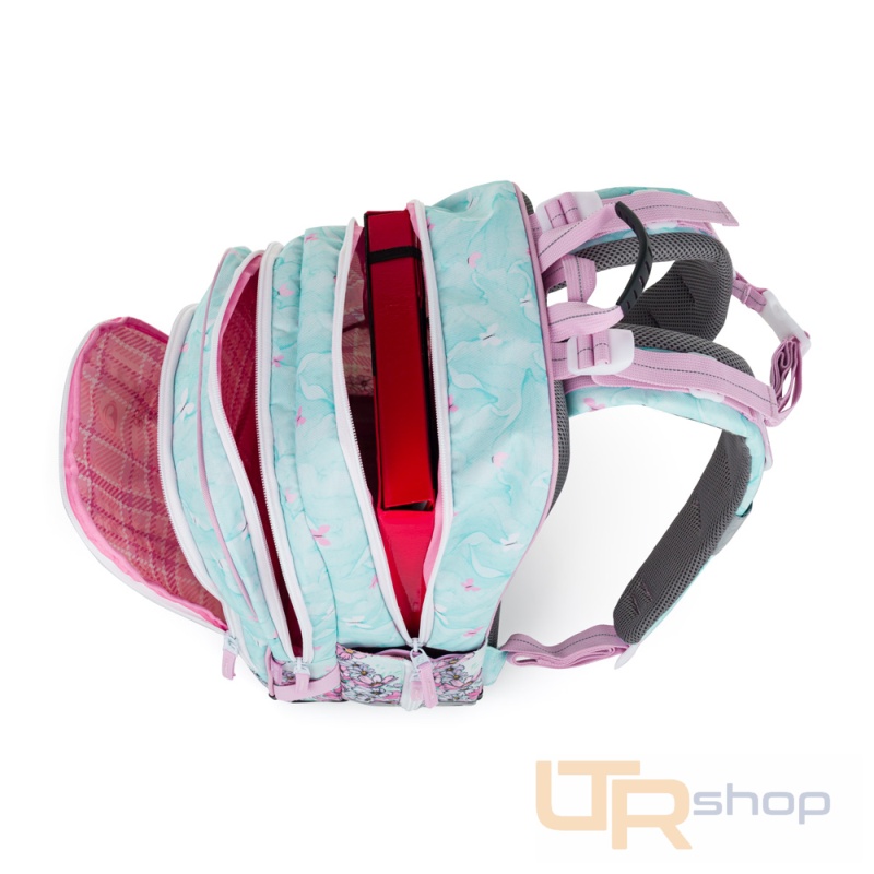 Ve vnitřním prostoru se budeš hezky orientovat: do největší kapsy patří velké desky, sešity a učebnice, do prostřední kapsy pouzdro a svačina.