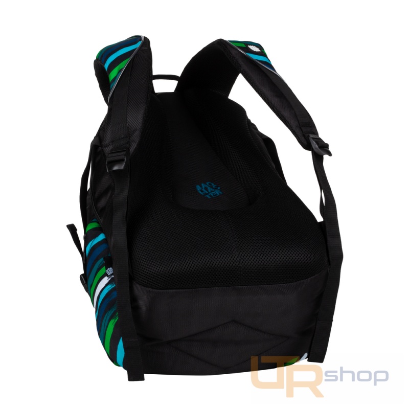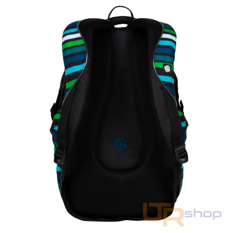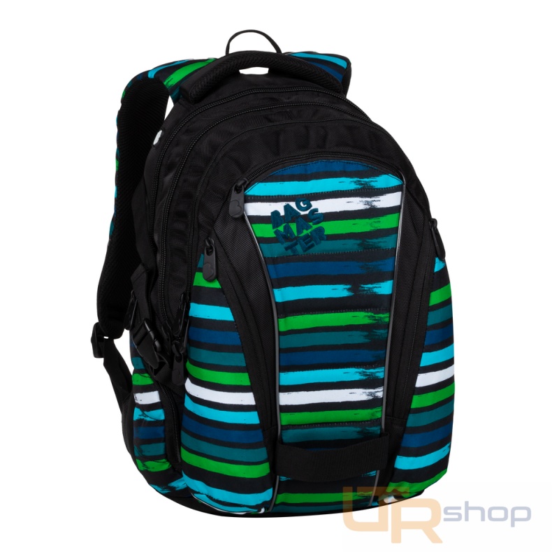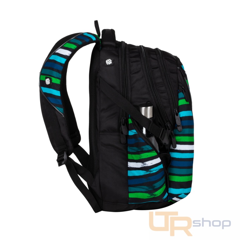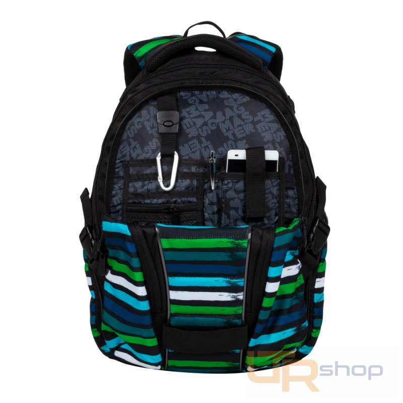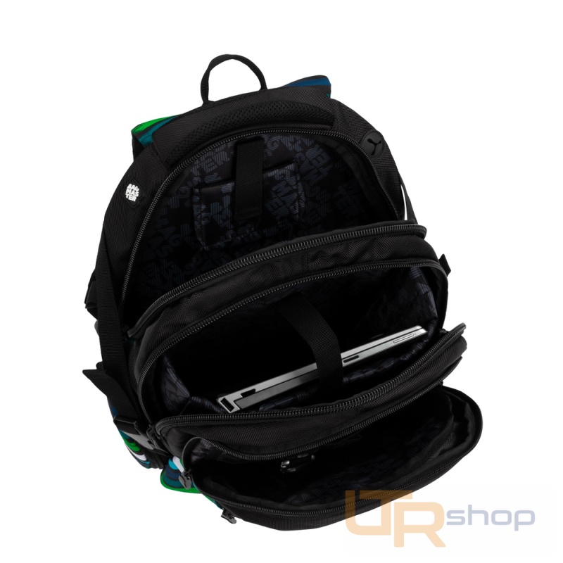 Tříkomorový, prostorný studentský batoh se spoustou kapes vhodný od 4. třídy ZŠ. Kapsa na 15" notebook s polstrováním. Anatomicky tvarovaná záda s příjemným polstrováním a ramenními popruhy. Dvě boční kapsy na láhev. Organizér, odnímatelný klip na klíče. Boční kompresní popruhy pro nastavení hloubky batohu nebo k fixaci větší lahve. Reflexní prvky.