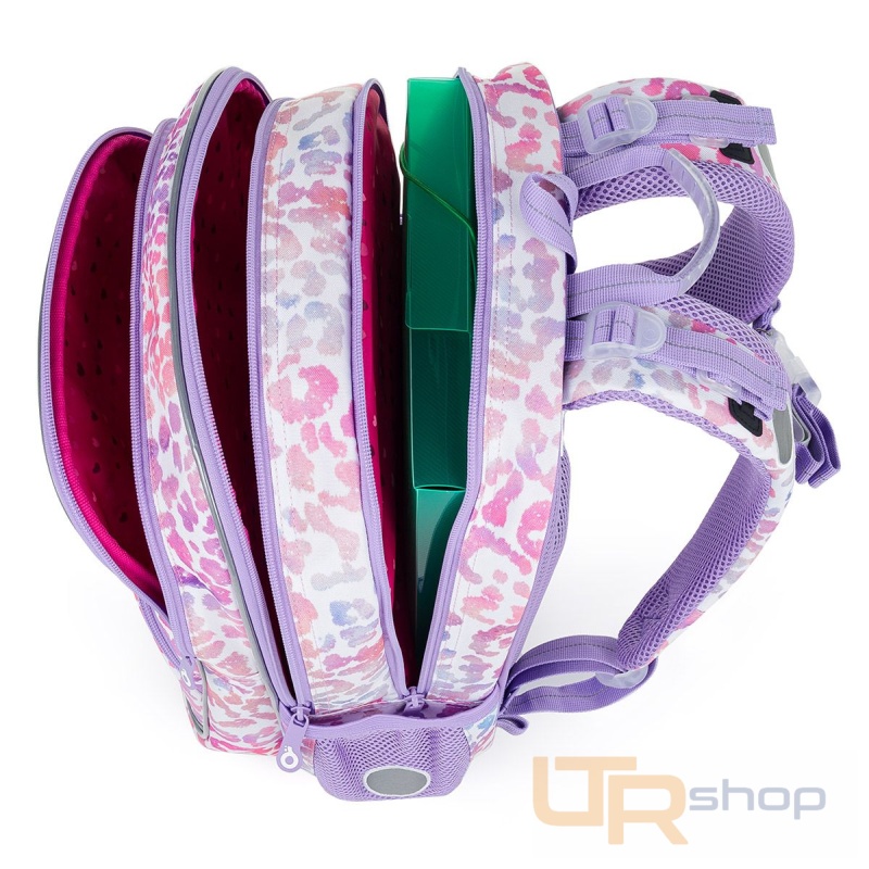 Batoh má dvě hlavní objemné komory. Zadní komora batohu je širší, proto do ní vložte nejtěžší učivo a směrem dopředu odlehčujte. V prostřední komoře je umístěna síťová kapsa na zip a jmenovka.