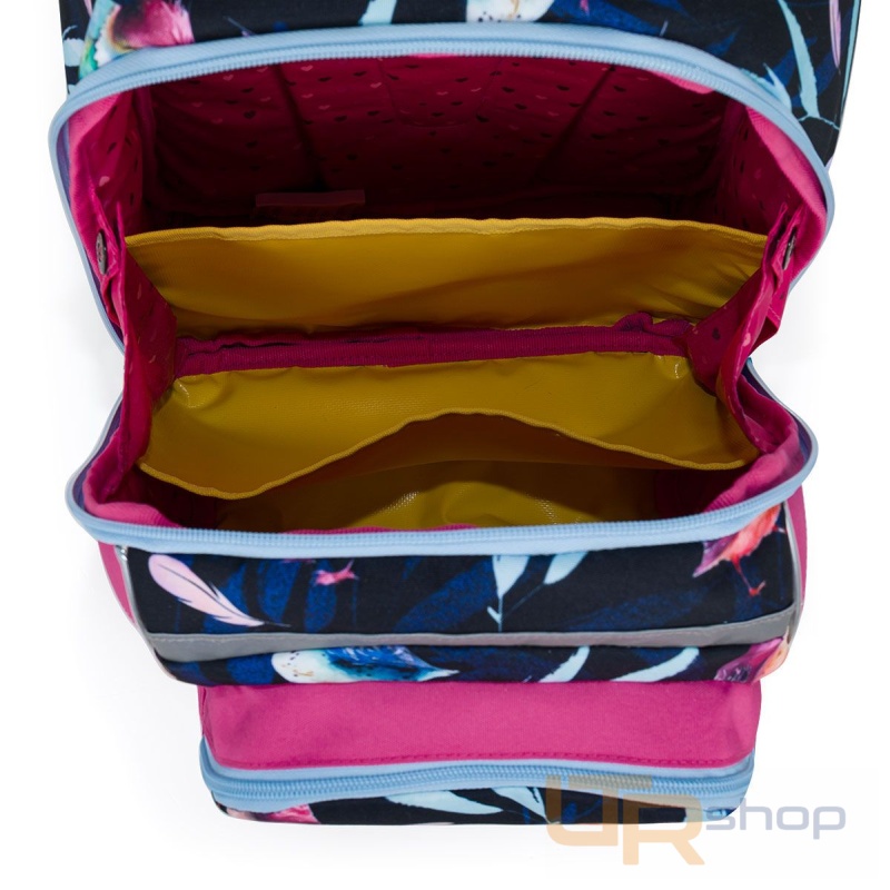 Batoh má jednu velkou komoru se žlutým nepropustným organizérem. Na přední části aktovky najdete další dvě praktické kapsy na zip, ve vnitřní kapse jmenovku.