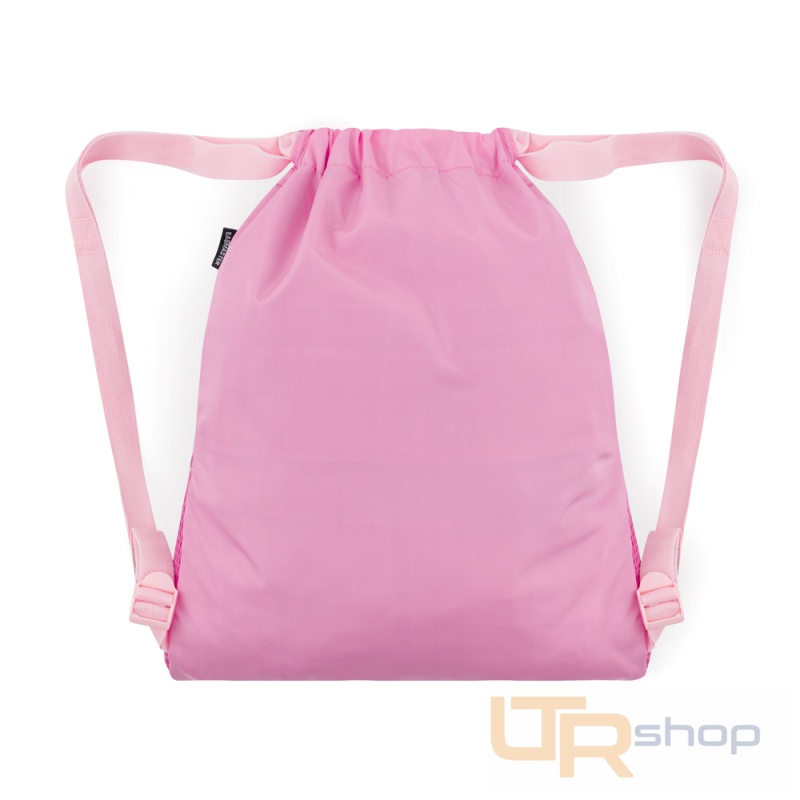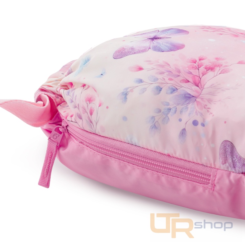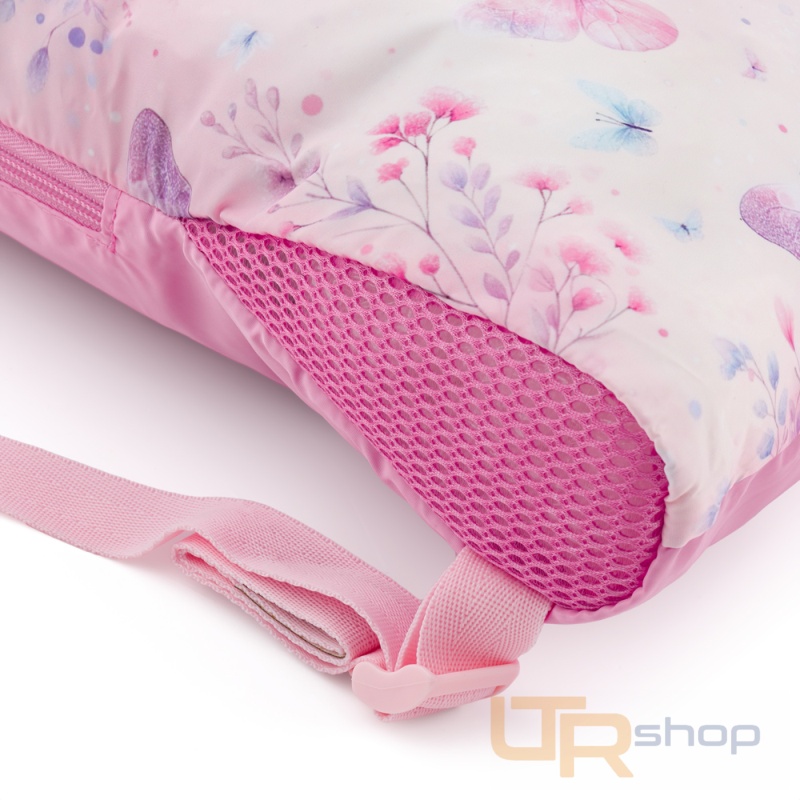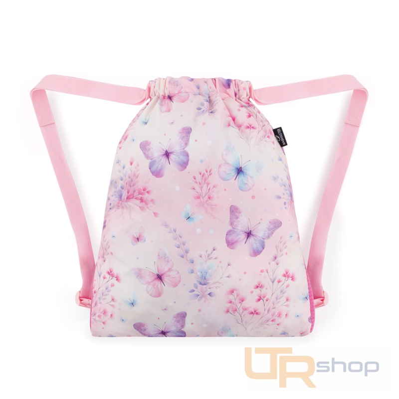 Školní látkový vak na přezůvky, úbor nebo věci na odpolední kroužek. Má nastavitelné ramenní popruhy, reflexní prvky, větrací otvory a třpytivý růžový motýlí motiv.