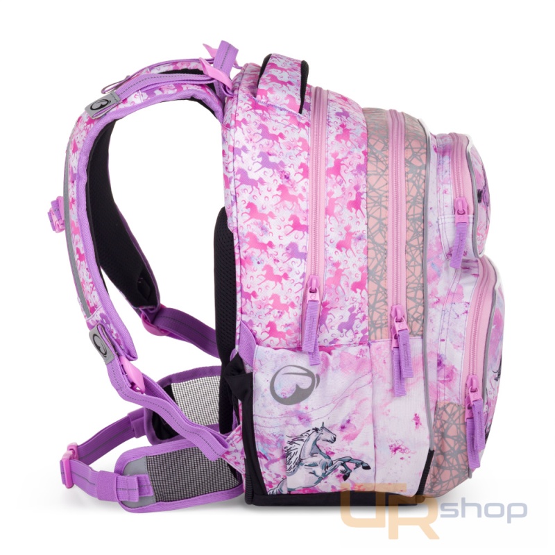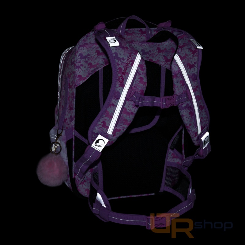 Jemný batoh pro škloláčky od 1. do 3. třídy. Je extra lehký, přitom prostorný. Má dvě velké komory a dvě praktické přední kapsičky. Stojí na plastových nožkách, ve tmě svítí reflexními prvky. Nový zádový systém s nastavitelným hrudním pásem a odlehčeným vyjímatelným bederním pásem myslí na zdravá záda dětí.