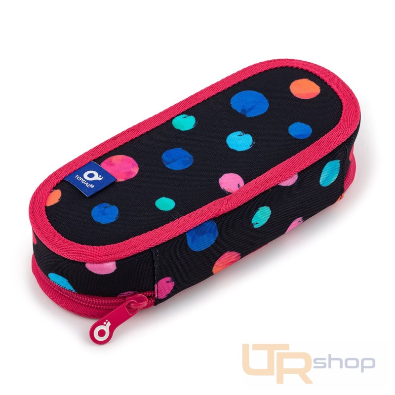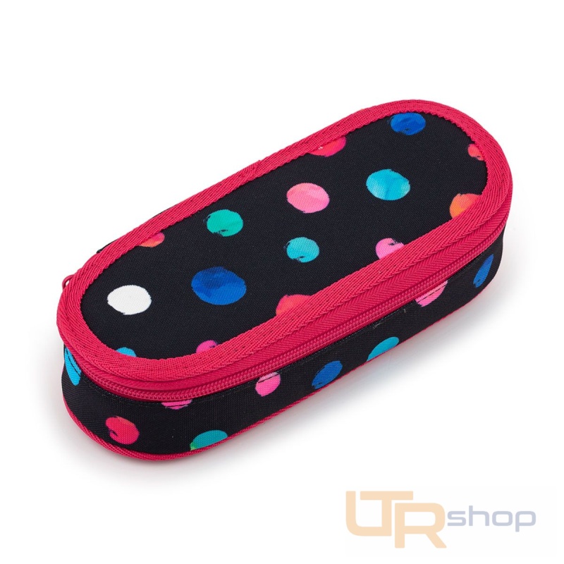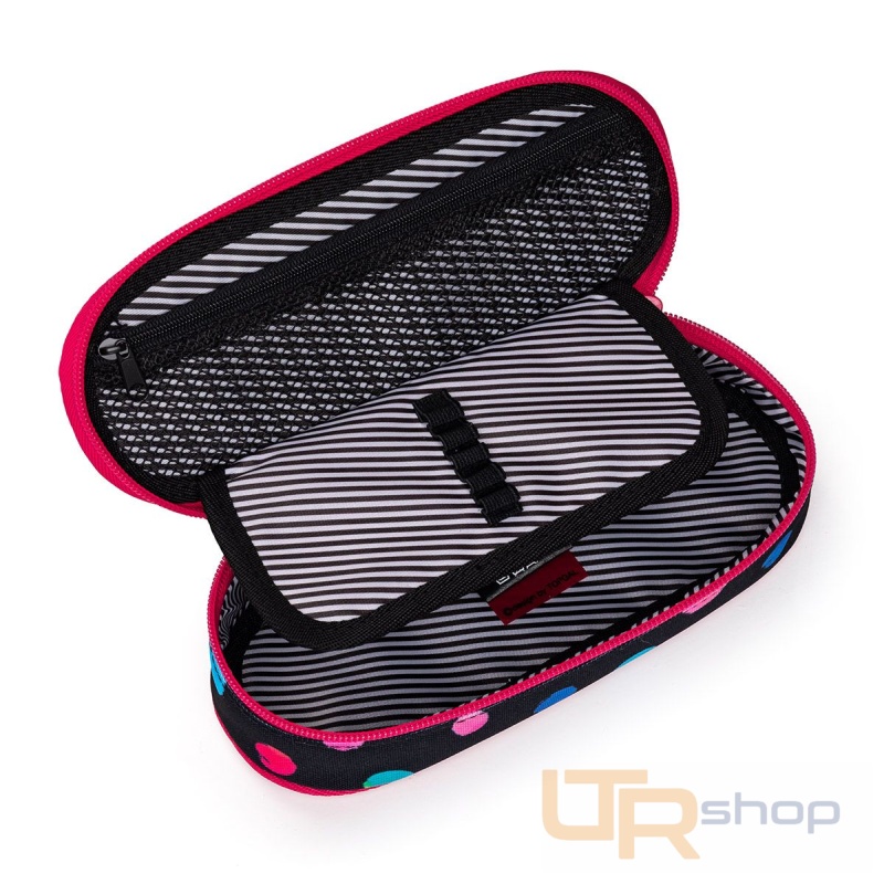 Oválný penál pro všechny potřebnosti. Uvnitř pouzdra je síťová kapsička na zip a klopa, na níž jsou umístěny gumičky pro uchycení celkem devíti tužek a propisek, které je potřeba mít přehledně uspořádané a po ruce. Volný prostor pod klopou pak umožňuje volně umístit další psací potřeby – pastelky, fixy, prostě cokoliv potřebujete.