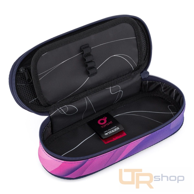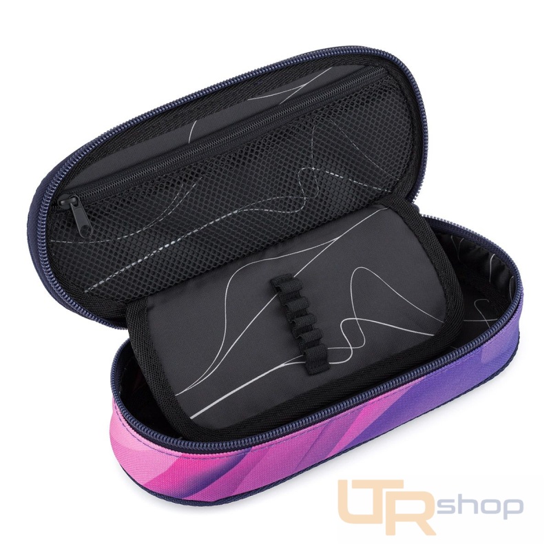 Oválný penál pro všechny starší školáky a studenty. Uvnitř pouzdra je síťová kapsička na zip a klopa s devíti gumičkami na propisky. Volný prostor pod klopou slouží pro další psací potřeby – pastelky, fixy, ale i pravítko nebo kružítko.