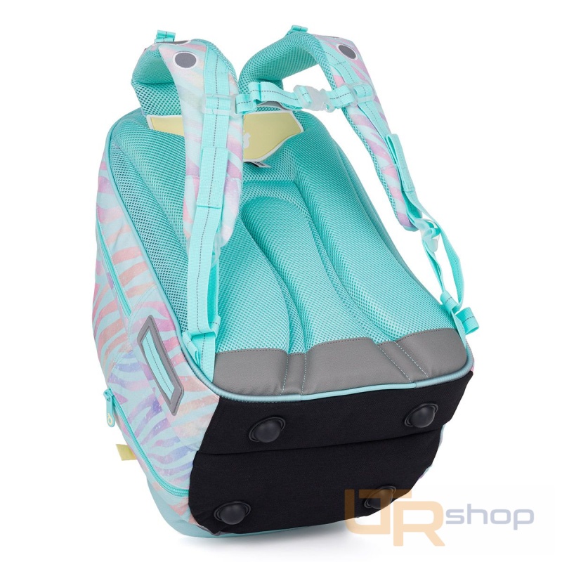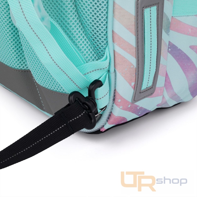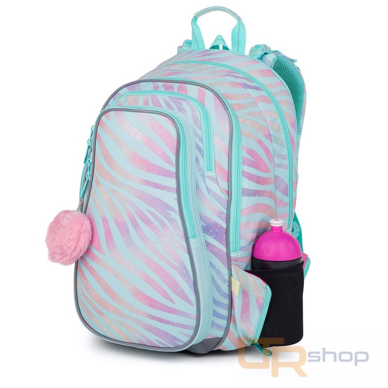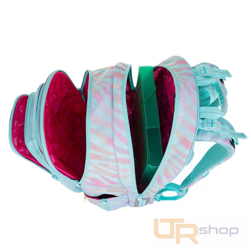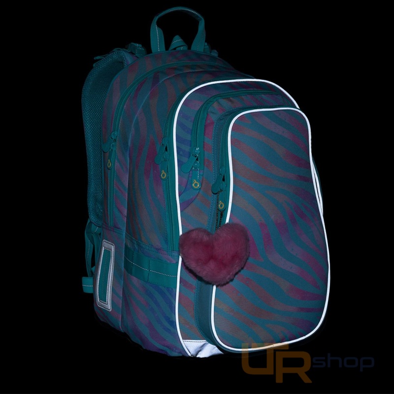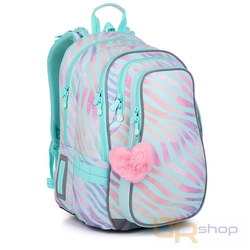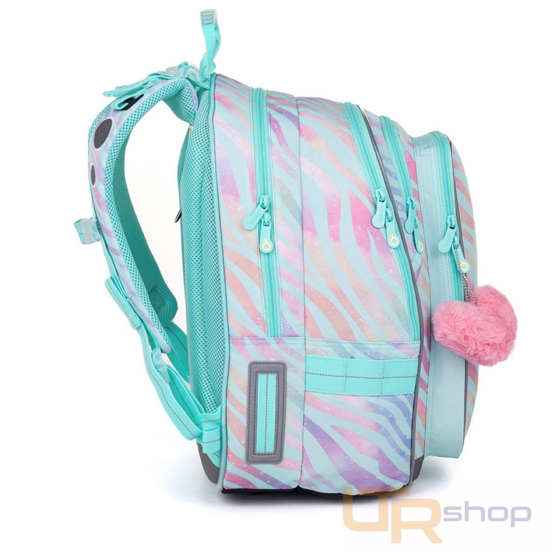 Tyrkysový dvoukomorový batoh s duhovým vzorem zebry může nosit každá slečna s výškou nad 125 cm. Mix oblíbených barev skvěle doplní plyšový přívěsek ve tvaru srdce.