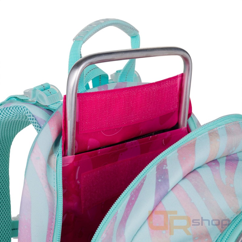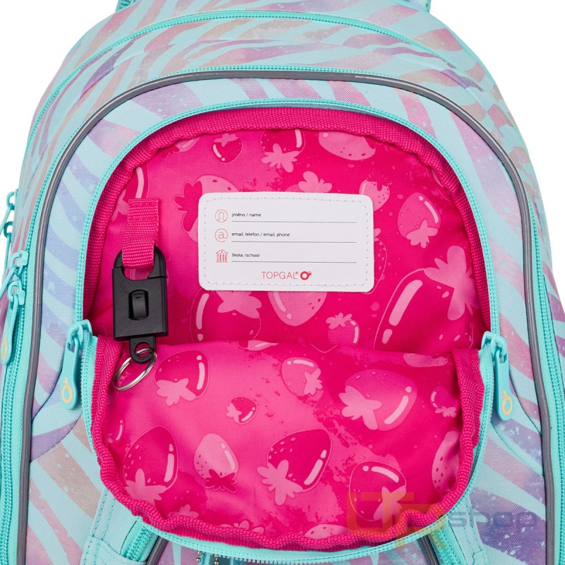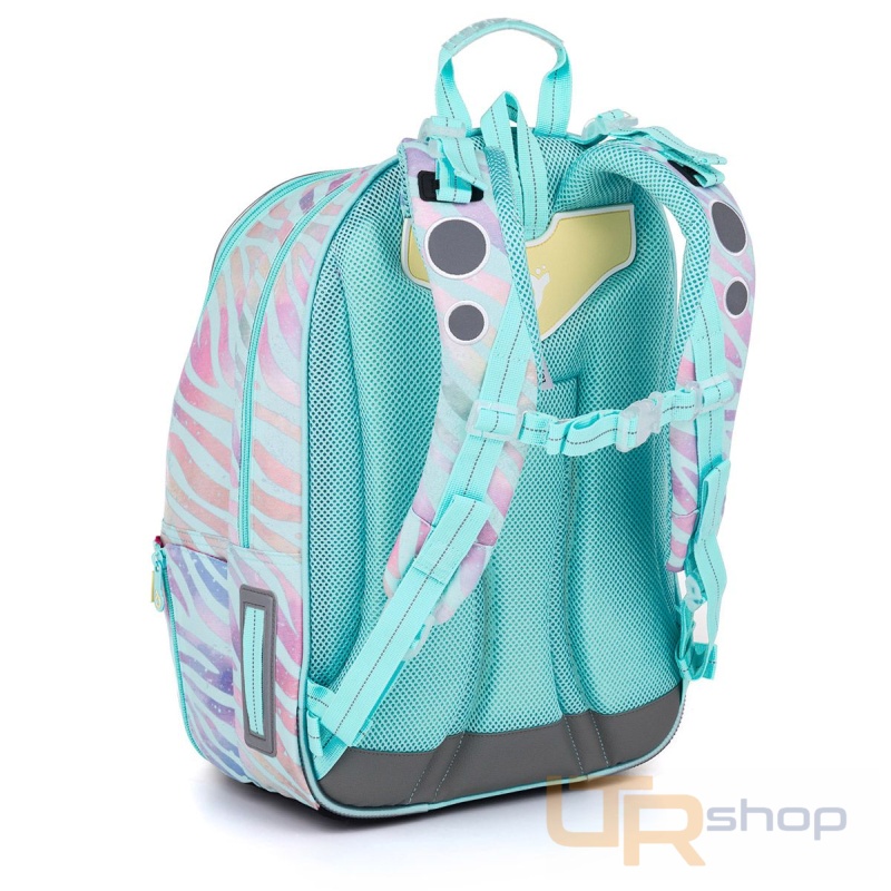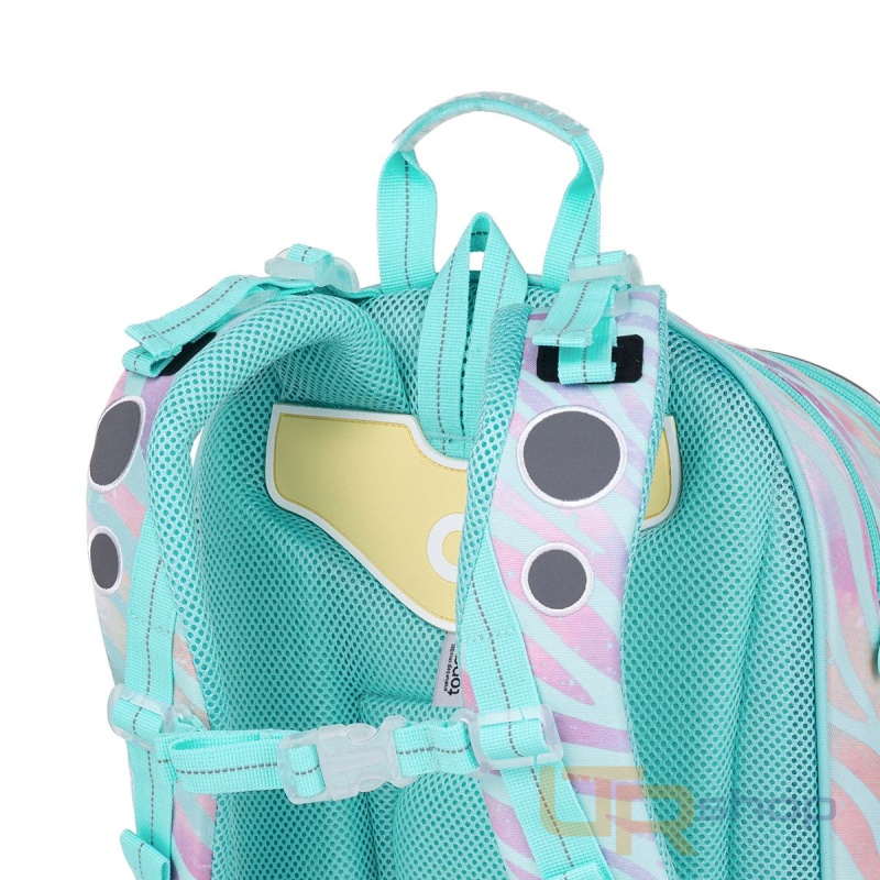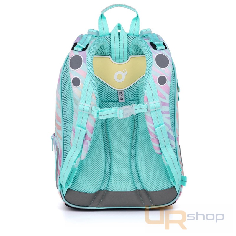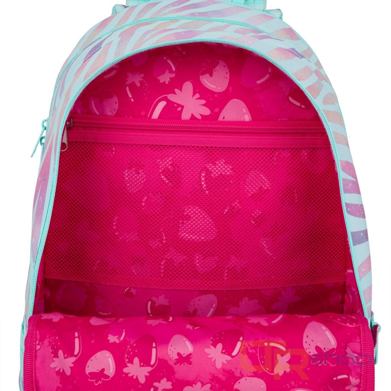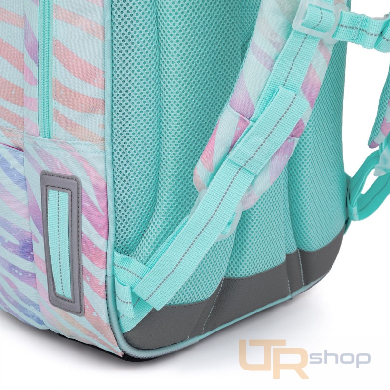 Tyrkysový dvoukomorový batoh s duhovým vzorem zebry může nosit každá slečna s výškou nad 125 cm. Mix oblíbených barev skvěle doplní plyšový přívěsek ve tvaru srdce.