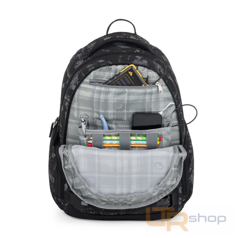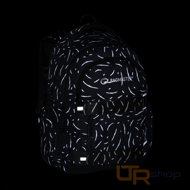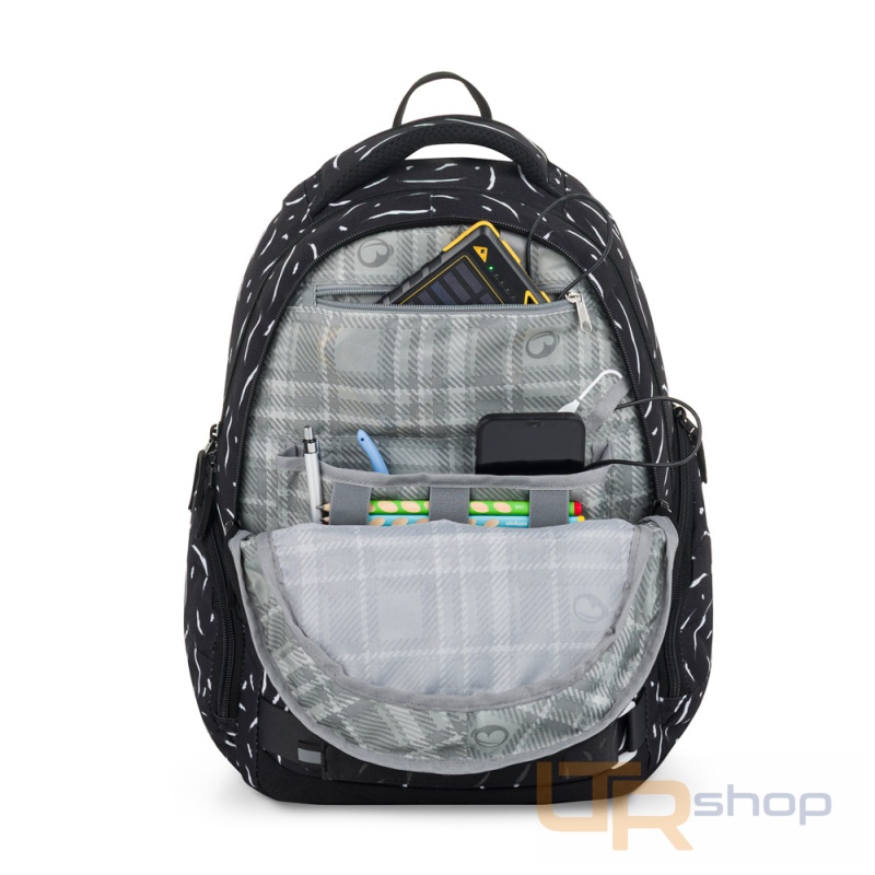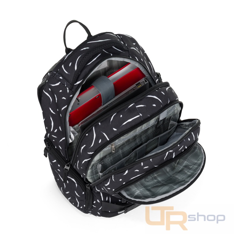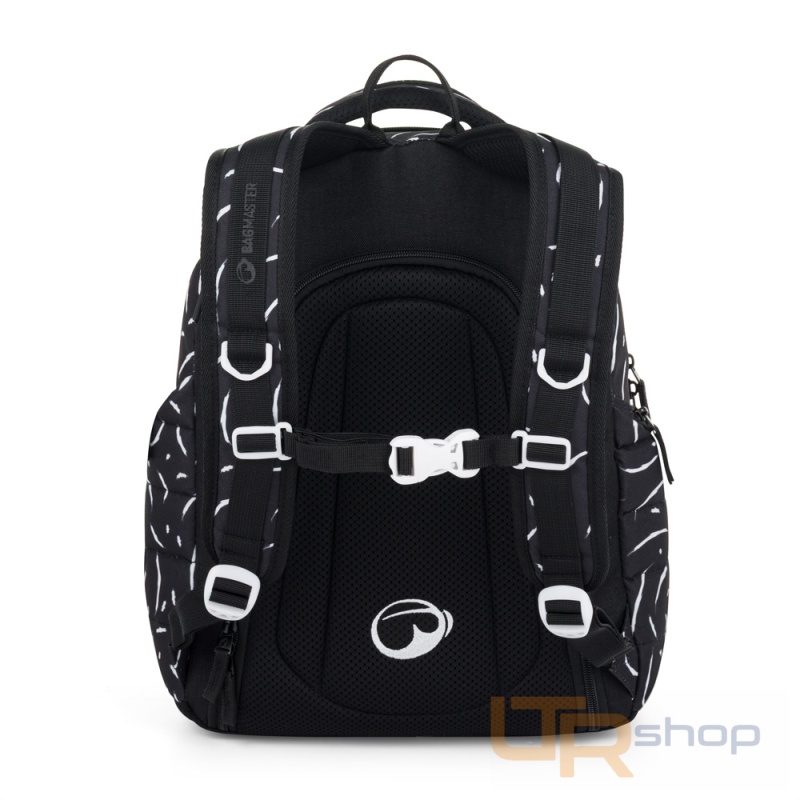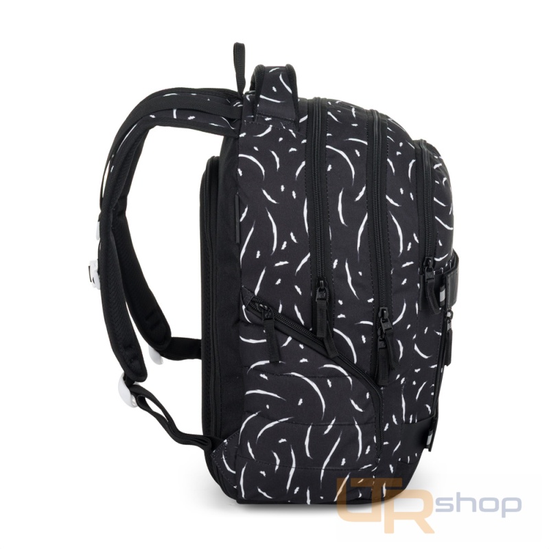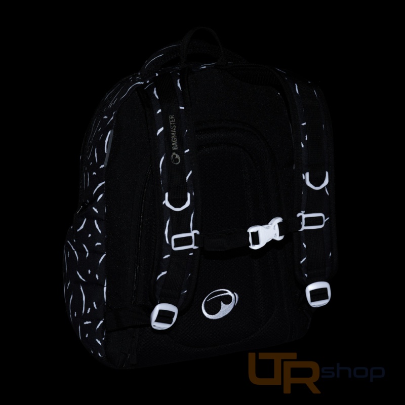 Elegantní černý batoh NOMAD s bílými detaily má dvě komory a přední kapsy, které jsou ideální na sešity, učebnice a drobné cennosti. Díky polstrovaným zádům a hrudnímu pásu se pohodlně nosí. Reflexní prvky a odolné zpracování zajistí, že batoh zůstane spolehlivým společníkem po další školní roky.