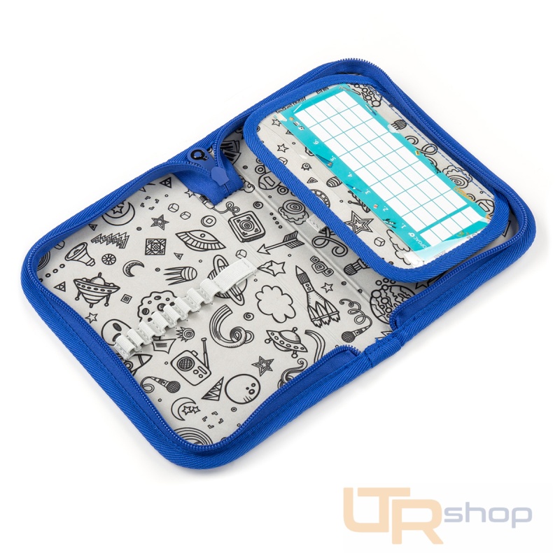 Jednopatrové školní pouzdro je vybaveno osmnácti klasickými gumovými úchyty na pastelky a fixy, čtyřmi širšími úchyty na pravítko, kružítko či nůžky a dvěma většími úchyty na gumu a ořezávátko. Pod klopnou z průhledné folie najdete rozvrh hodin, ale třeba poslouží i na taháky :-)