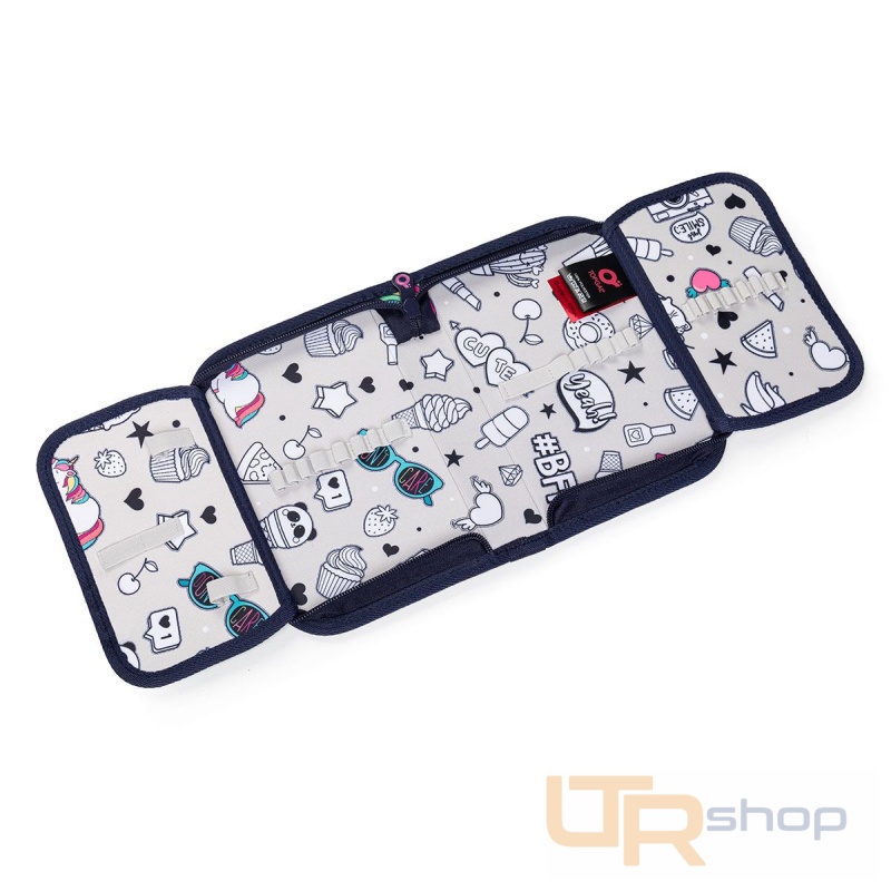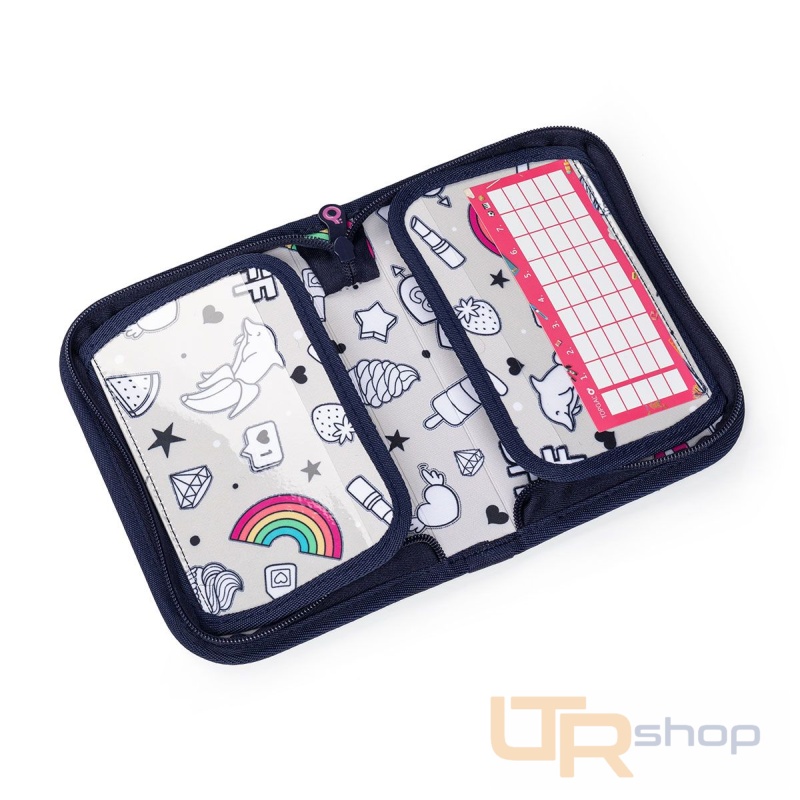 Jednopatrové školní pouzdro se dvěma klopnami je vybaveno 21 klasickými gumovými úchyty na pastelky a fixy, třema širšími úchyty na pravítko, kružítko či nůžky a dvěma většími úchyty na gumu a ořezávátko. Pod klopou z průhledné folie najdete rozvrh hodin, druhé poslouží třeba i na taháky :-)