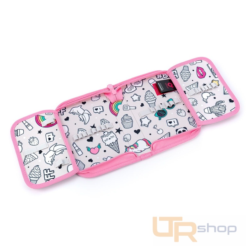 Jednopatrové školní pouzdro se dvěma klopnami je vybaveno 21 klasickými gumovými úchyty na pastelky a fixy, třema širšími úchyty na pravítko, kružítko či nůžky a dvěma většími úchyty na gumu a ořezávátko. Pod klopou z průhledné folie najdete rozvrh hodin, druhé poslouží třeba i na taháky :-)