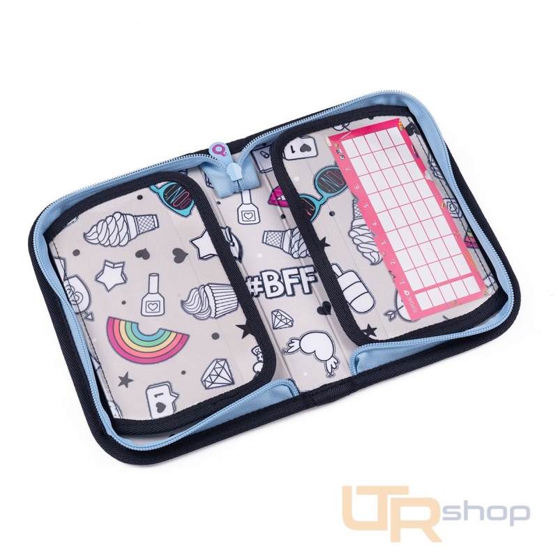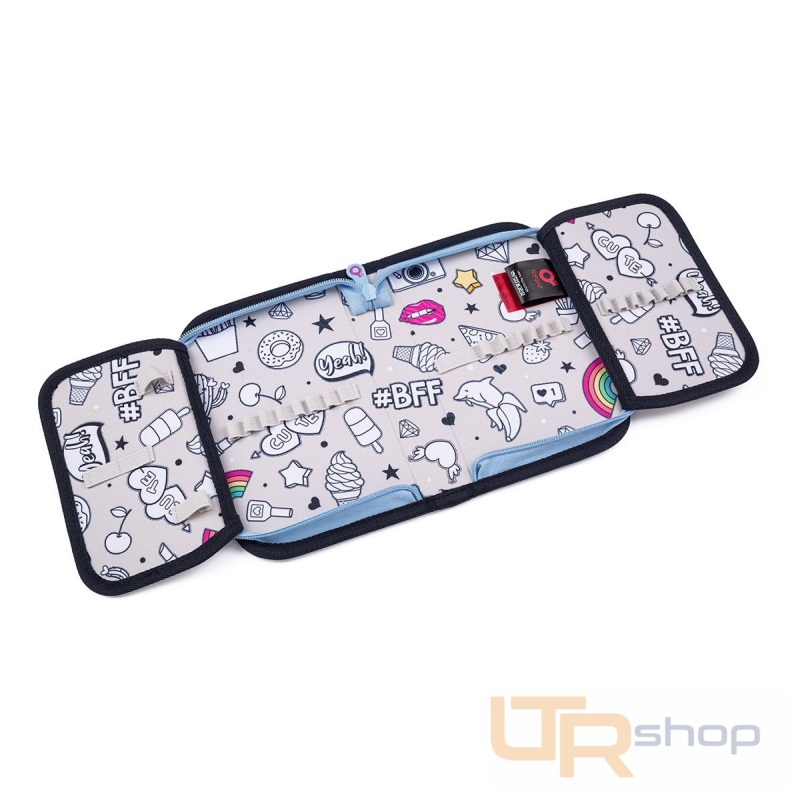 Jednopatrové školní pouzdro se dvěma klopnami je vybaveno 21 klasickými gumovými úchyty na pastelky a fixy, třema širšími úchyty na pravítko, kružítko či nůžky a dvěma většími úchyty na gumu a ořezávátko. Pod klopou z průhledné folie najdete rozvrh hodin, druhé poslouží třeba i na taháky :-)