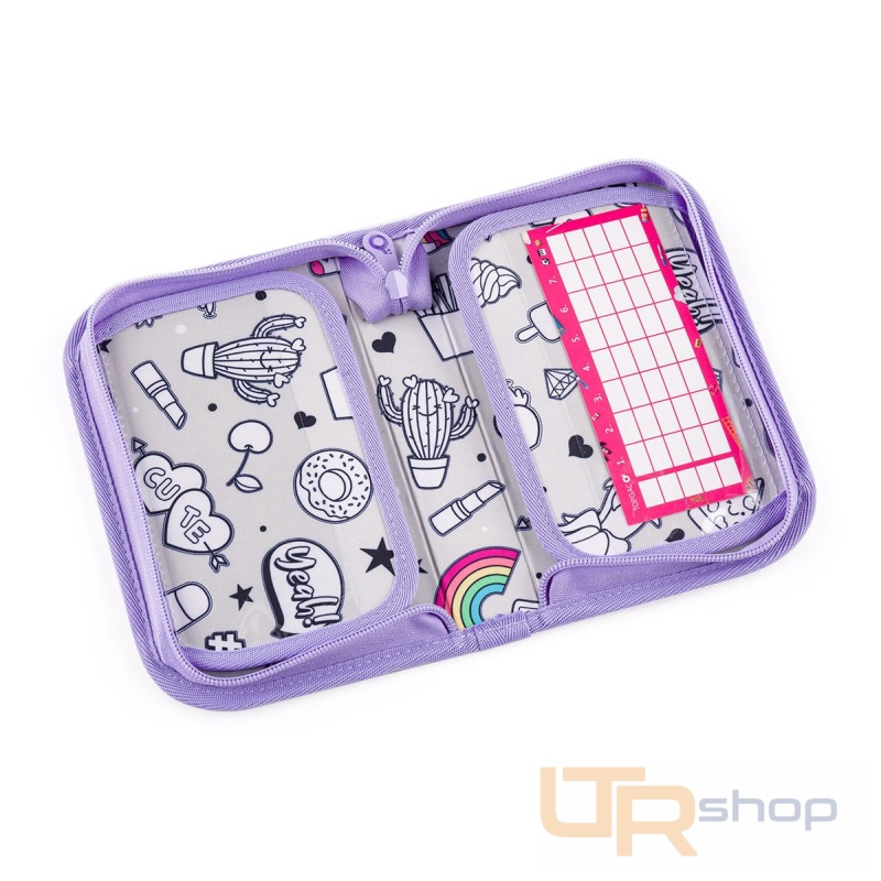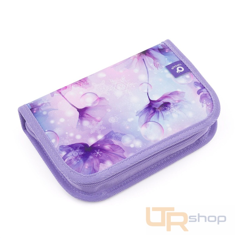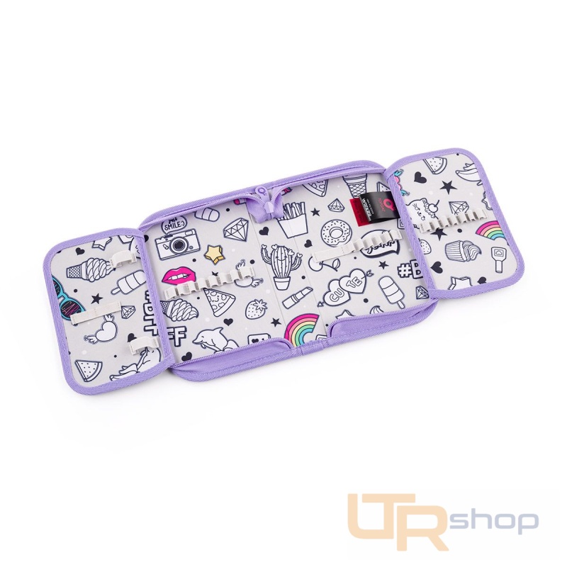 Jednopatrové školní pouzdro se dvěma klopami. Díky gumovým úchytům se do nich vejde celkem dvacetjedna pastelek, tužek a fixek. Tři širší úchyty poslouží na pravítko, kružítko či nůžky. Dva větší na gumu a ořezávátko.