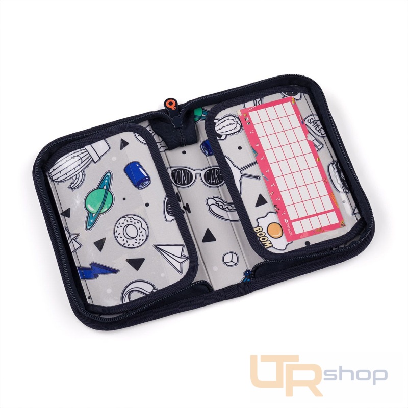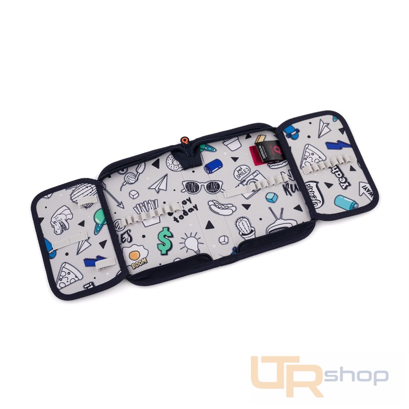 Jednopatrové školní pouzdro se dvěma klopami. Díky gumovým úchytům se do nich vejde celkem dvacetjedna pastelek, tužek a fixek. Tři širší úchyty poslouží na pravítko, kružítko či nůžky. Dva větší na gumu a ořezávátko.
