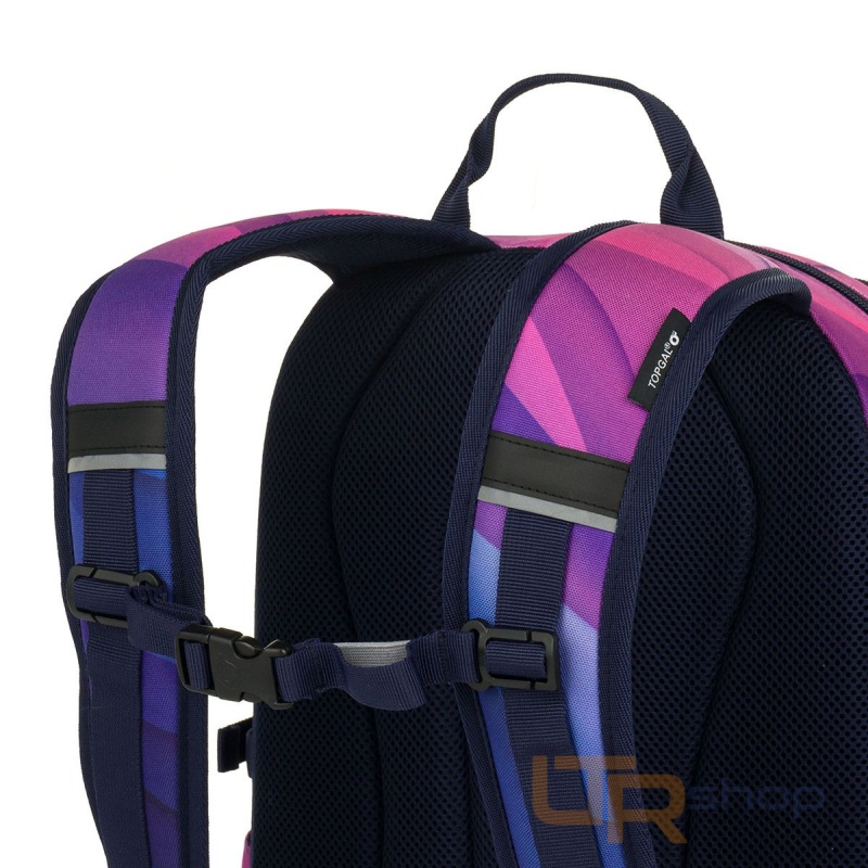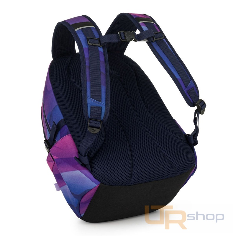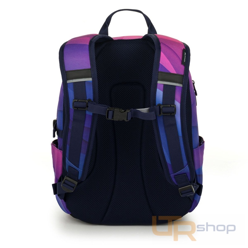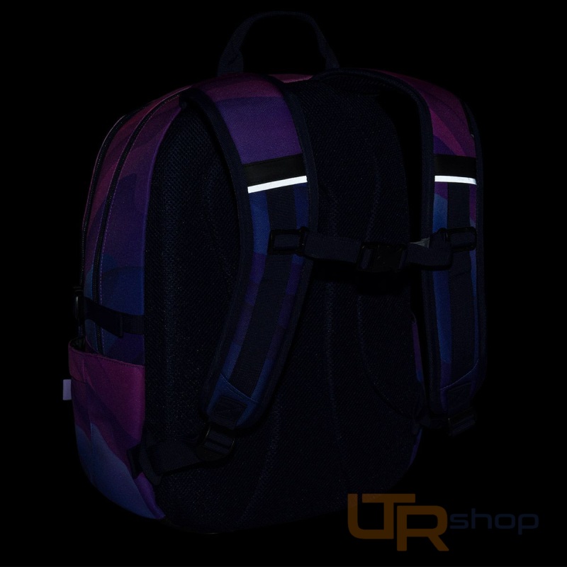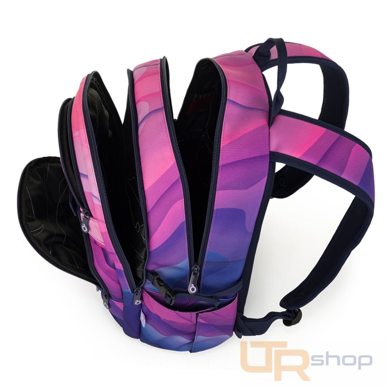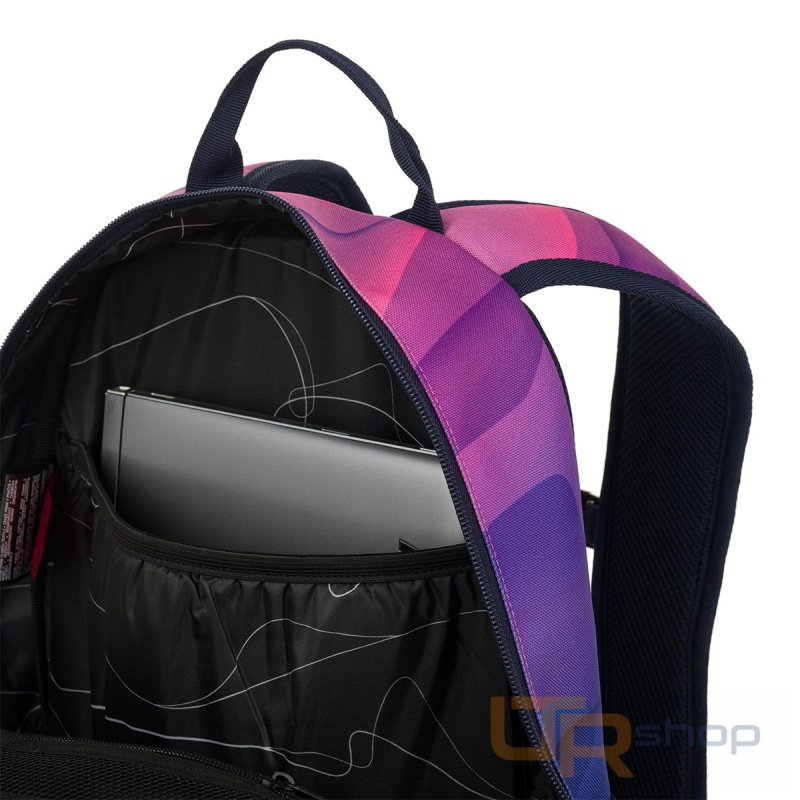Dvoukomorový batoh se stylovou nášivkou v oblíbené růžovo fialové kombinaci. Záda batohu jsou polstrovaná a anatomicky tvarovaná z měkké pěny. Uvnitř zadní komory je umístěna polstrovaná kapsa na notebook a síťovaná kapsa na zip, v druhé komoře najdete klíčenku.