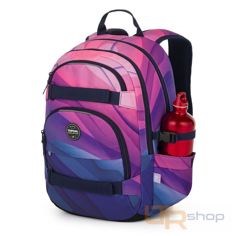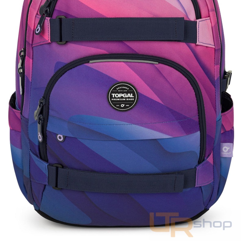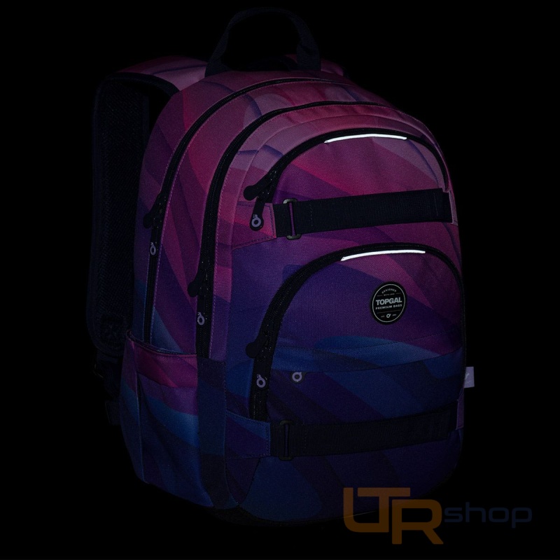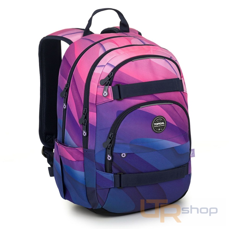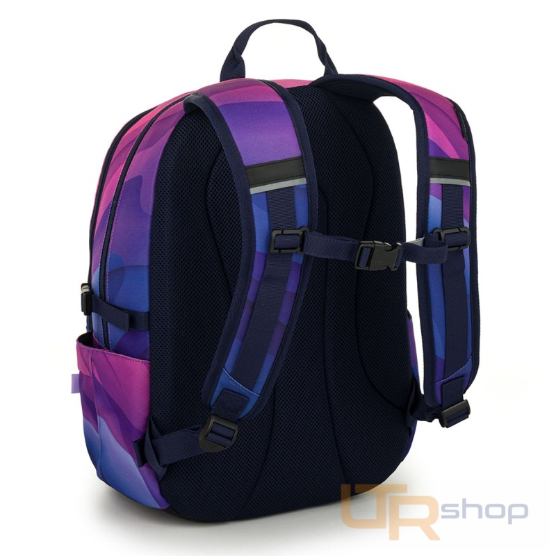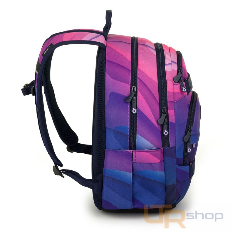 Dvoukomorový batoh se stylovou nášivkou v oblíbené růžovo fialové kombinaci. Záda batohu jsou polstrovaná a anatomicky tvarovaná z měkké pěny. Uvnitř zadní komory je umístěna polstrovaná kapsa na notebook a síťovaná kapsa na zip, v druhé komoře najdete klíčenku.